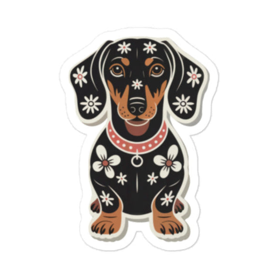 This sticker features a dachshund dog with adorable tattoo flowers and face paint. Ready to go with you to your next festival.