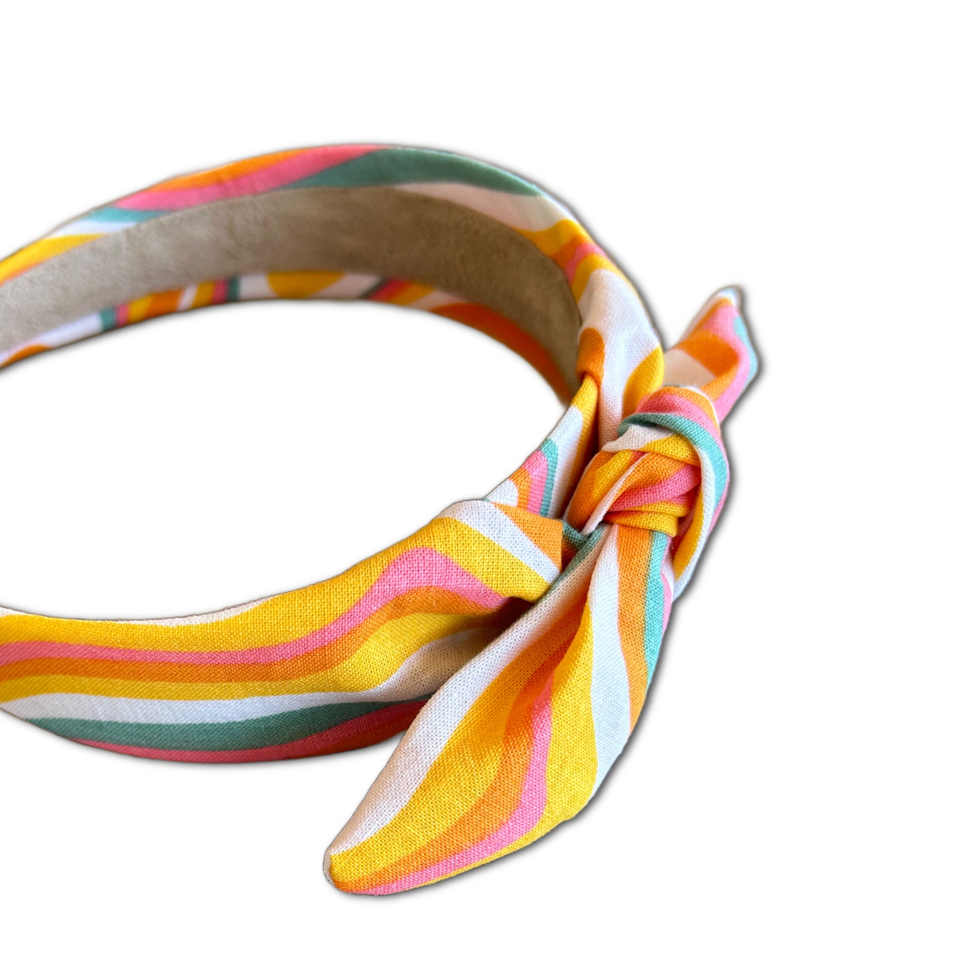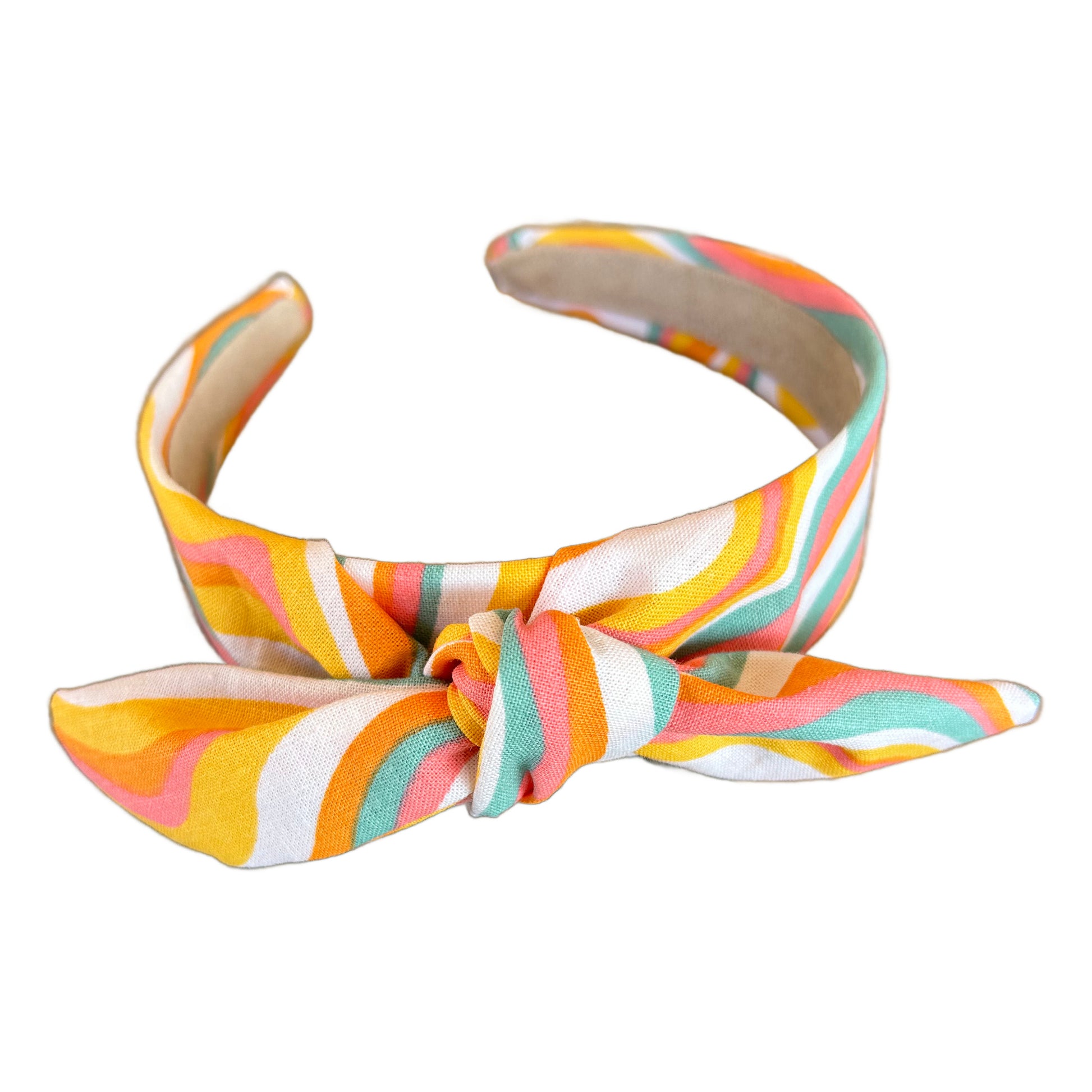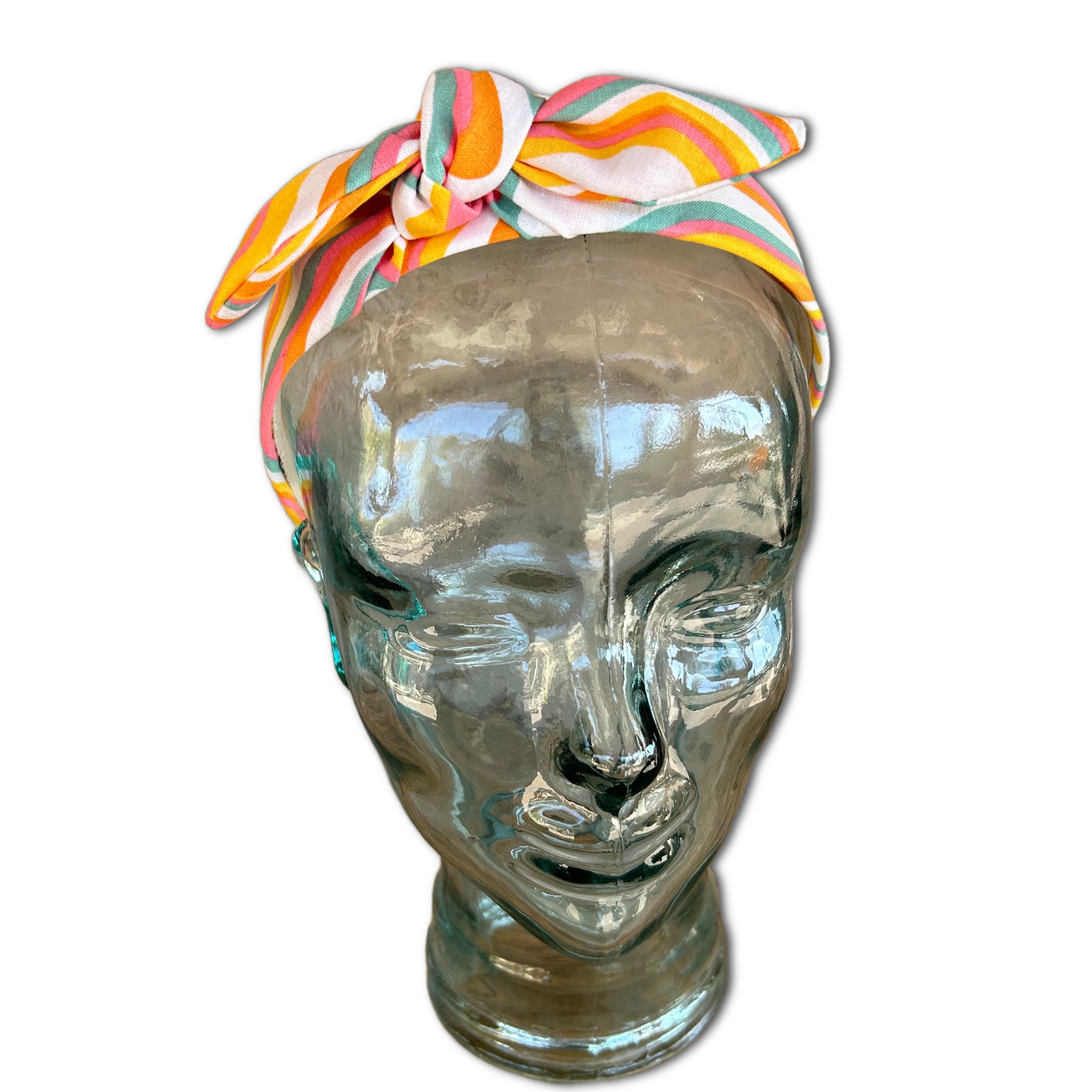 Let me introduce you to our newest creation. This brightly colored swirly print has sorta a 1960's vibe to it. At least, that is how we see it. If you have a fun and eclectic style this knot tied headband is right for you.